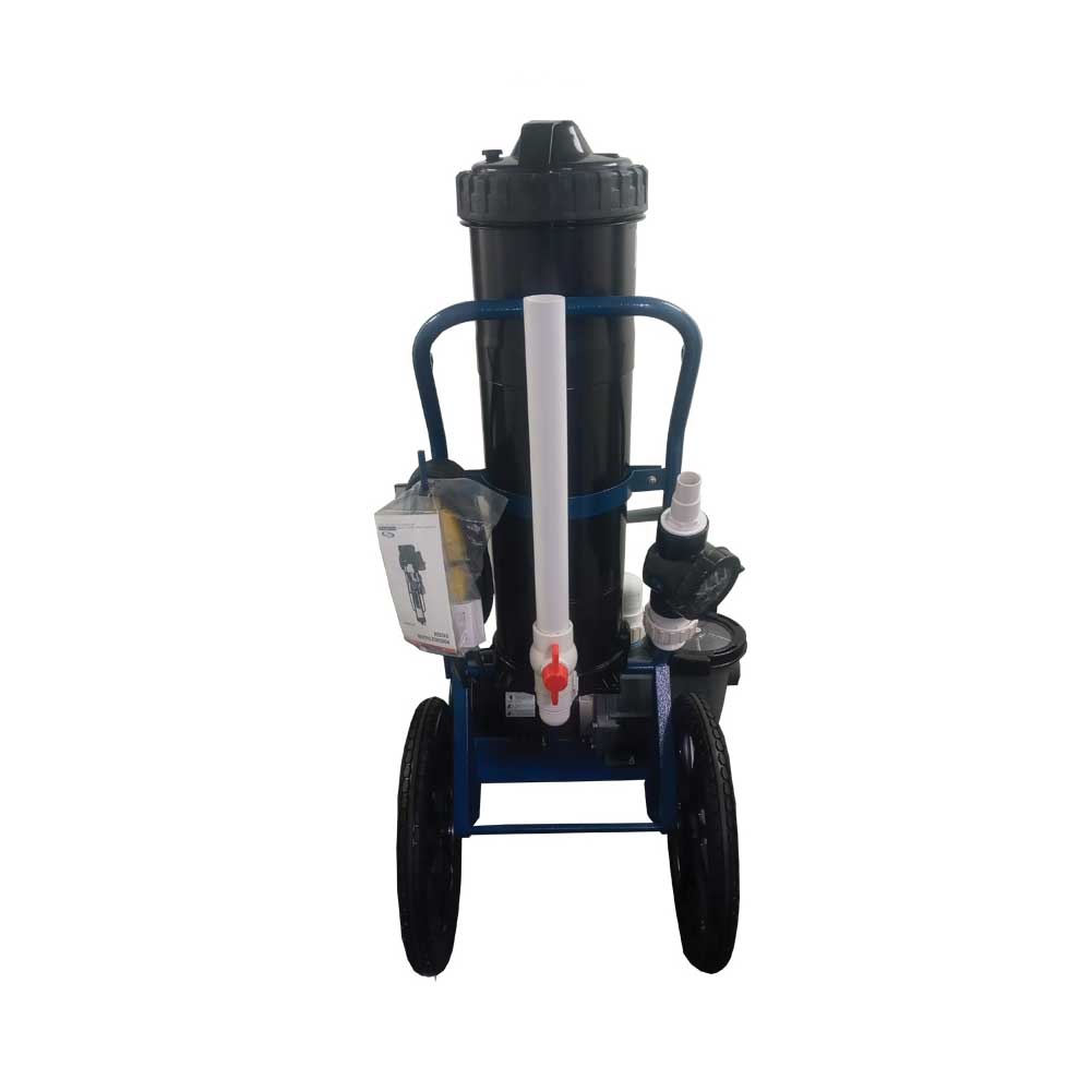 A complete equipment pad on a dolly. For maintenance of pools, nothing sucks up fine particles like dust or silt like a cartridge filter ( down to 10 microns) and can replace a filtration system while repairs are made. A critical tool for every Pool Pro.